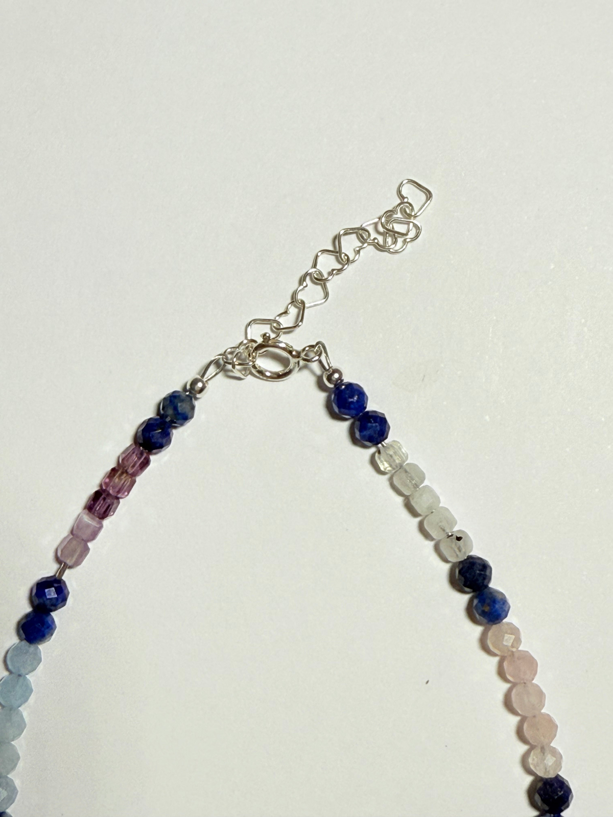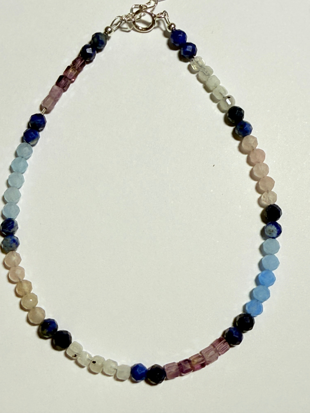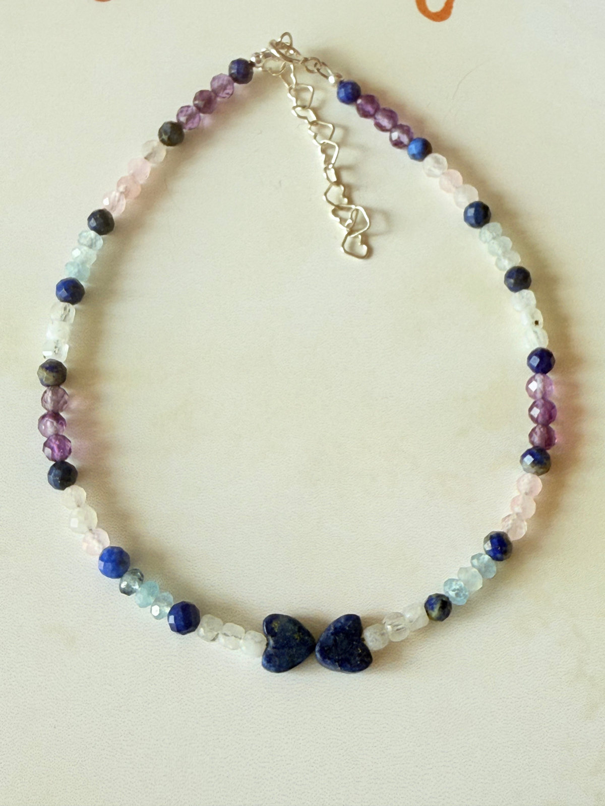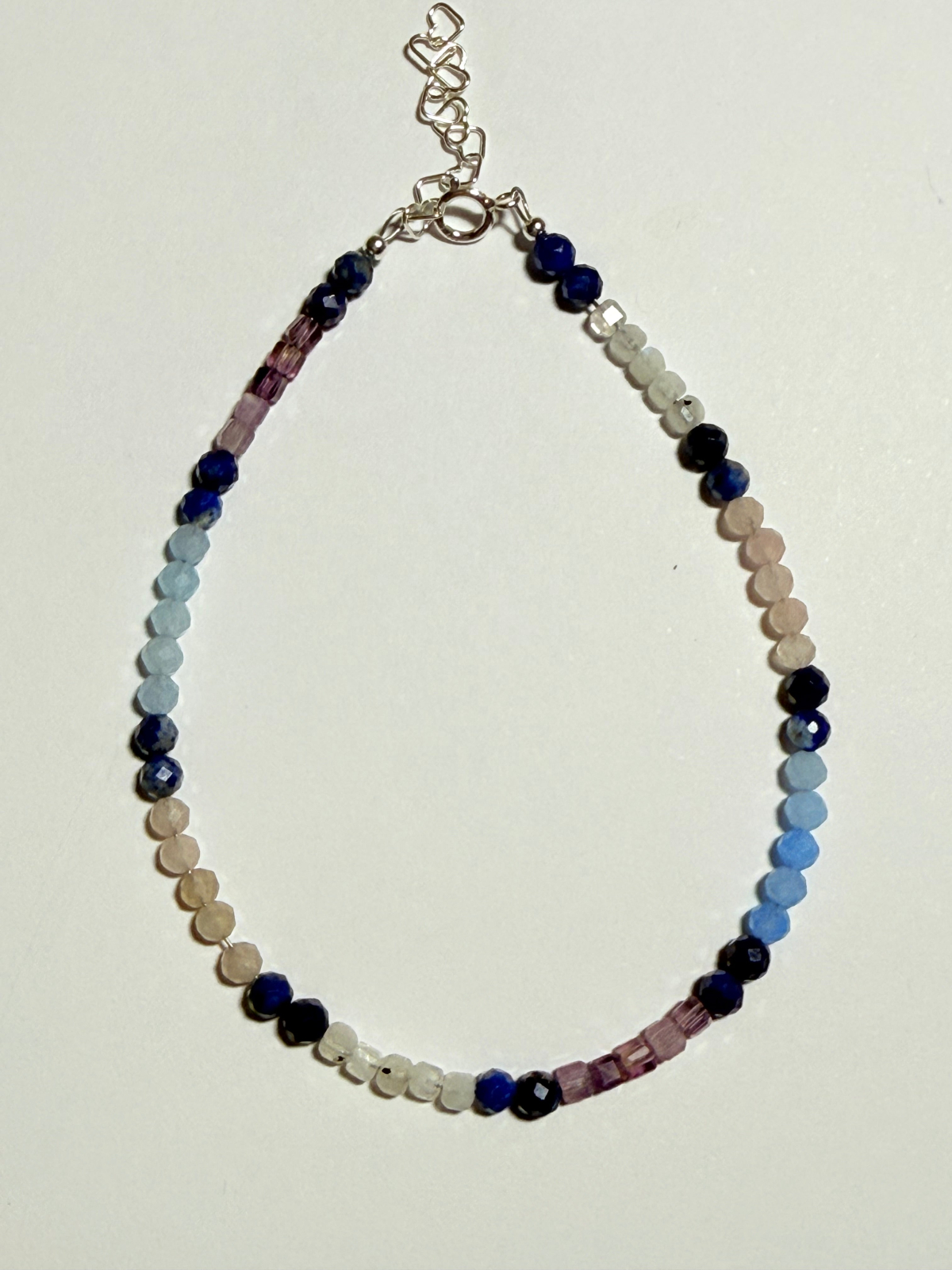 Brățara Mayris GEMS, dedicată zodiei Pești, este realizată manual dintr-o selecție armonioasă de cristale naturale – Acvamarin, Ametist, Piatra Lunii, Lapis Lazuli și Cuarț Roz – completată de elemente din Argint 925.