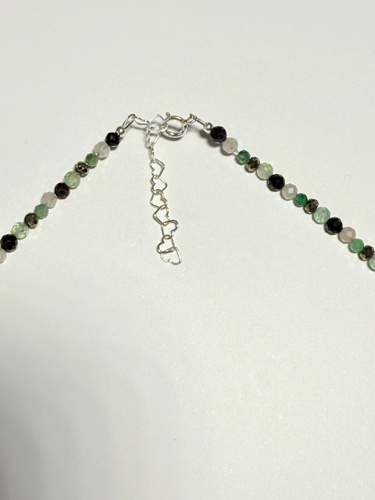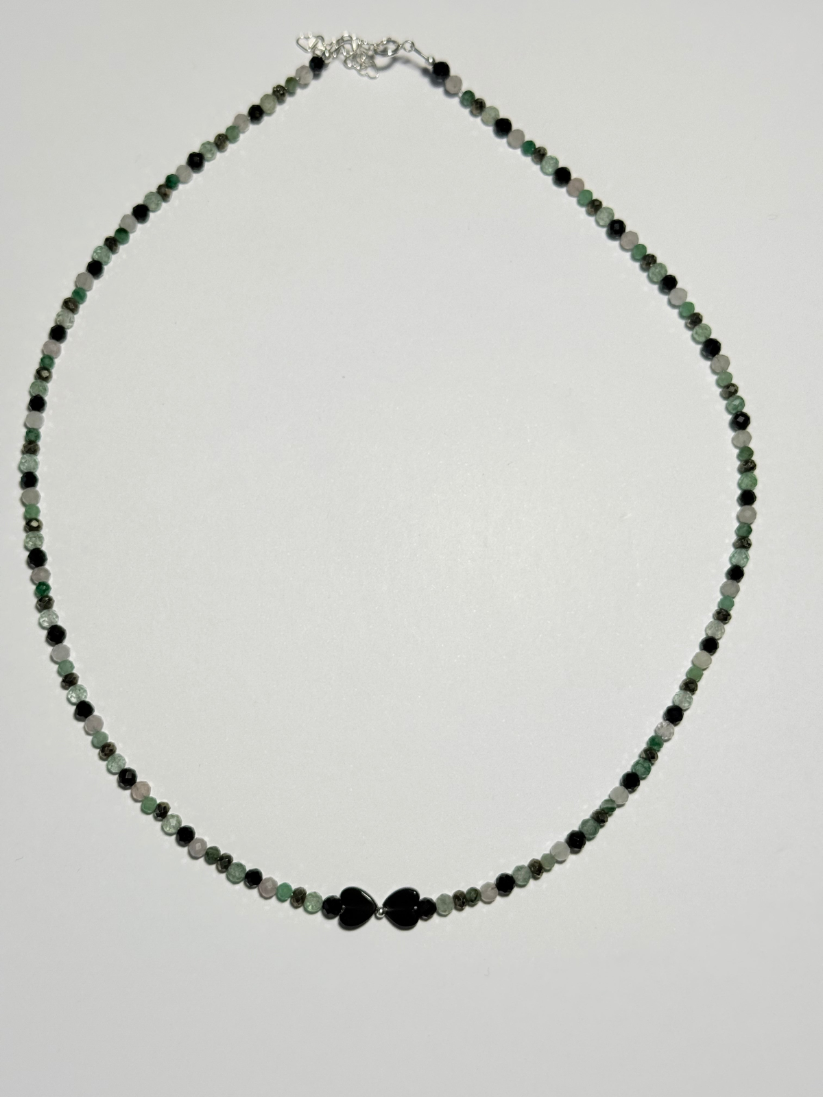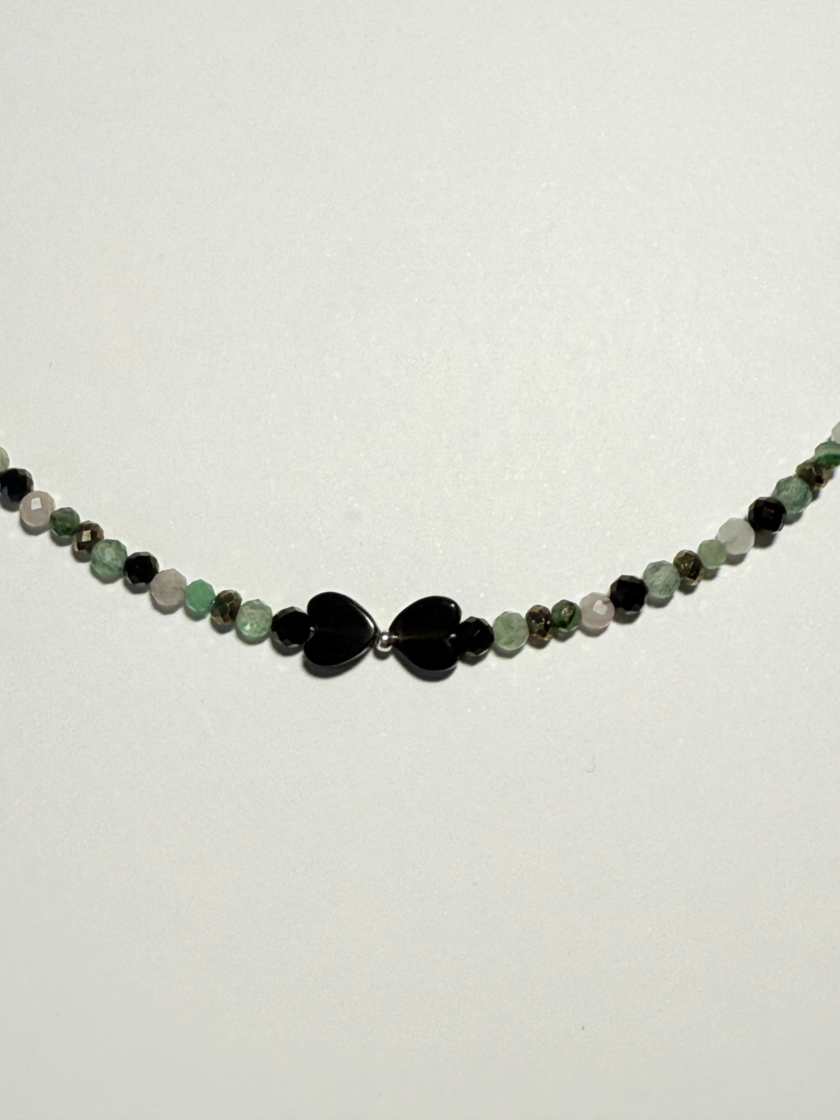 Colierul Mayris GEMS, creat manual special pentru Zodia Taur, este realizat dintr-o combinație rafinată de pietre semiprețioase: Onix Negru, Pirită, Aventurin Verde, Smarald, Cuarț Roz,de 2-3 mm, completate cu elemente din Argint 925. Designul fin și minimalist este accentuat de două pietre centrale de Onix Negru în formă de inima, care creează un punct de echilibru vizual și energetic.